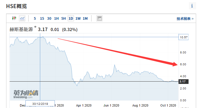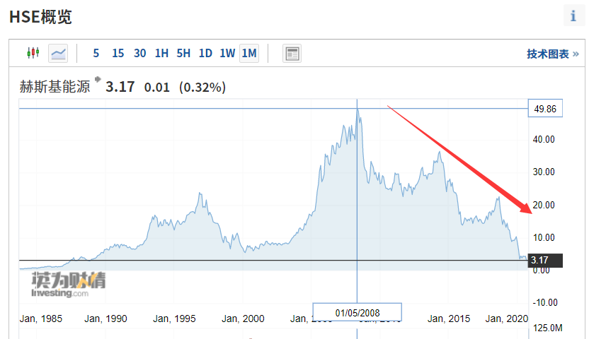 根据英为财经行情显示,1983年上市的赫斯基能源在 2008 年 5 月达到了 历史最高点49.86加元/股。随后开始逐渐下滑。截至目前,股价最低仅有 3.17 加元 / 股,跌幅近 94%。