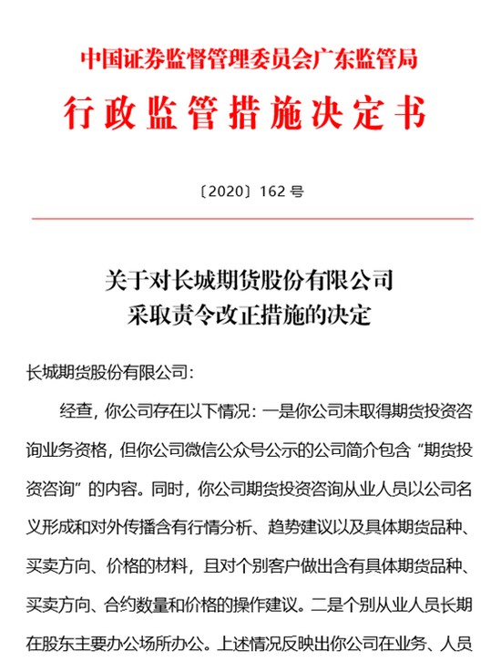 关于对长城期货股份有限公司采取责令改正措施的决定显示,公司存在两项违规行为:一是公司未取得期货投资咨询业务资格,但公司微信公众号公示的公司简介包含“期货投资咨询”的内容。同时,公司期货投资咨询从业人员以公司名义形成和对外传播含有行情分析、趋势建议以及具体期货品种、买卖方向、价格的材料,且对个别客户做出含有具体期货品种、买卖方向、合约数量和价格的操作建议。二是个别从业人员长期在股东主要办公场所办公。
