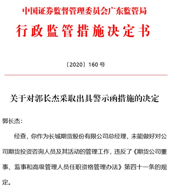 因员工违规代客理财和公司违规开展咨询业务,长城期货公司、高管、员工连收广东证监局4张罚单。