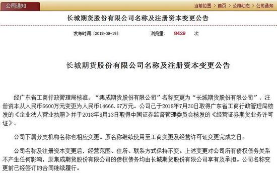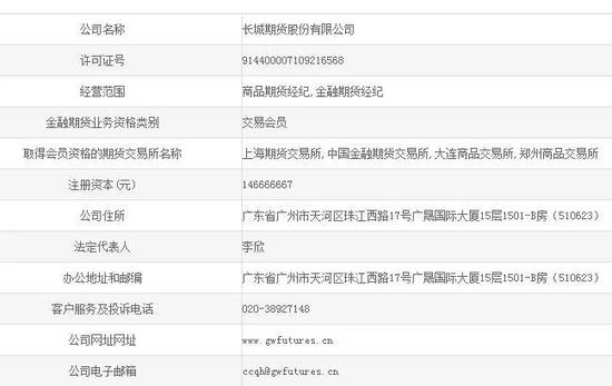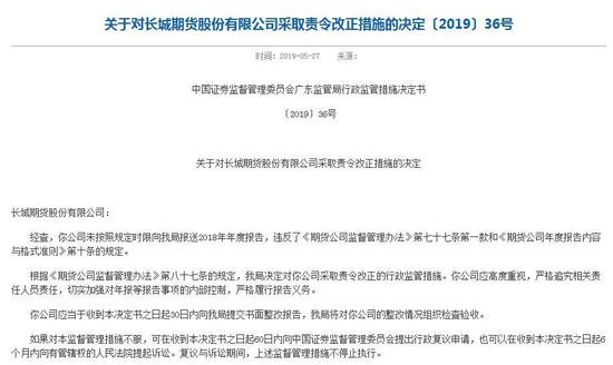 2019年5月,长城期货因未在规定时限报关2018年年度报告,收到广东监管局罚单。公开资料显示,经查,长城期货股份有限公司未按照规定时限向广东证监局报送2018年年度报告,违反了《期货公司监督管理办法》第七十七条第一款和《期货公司年度报告内容与格式准则》第十条的规定。
