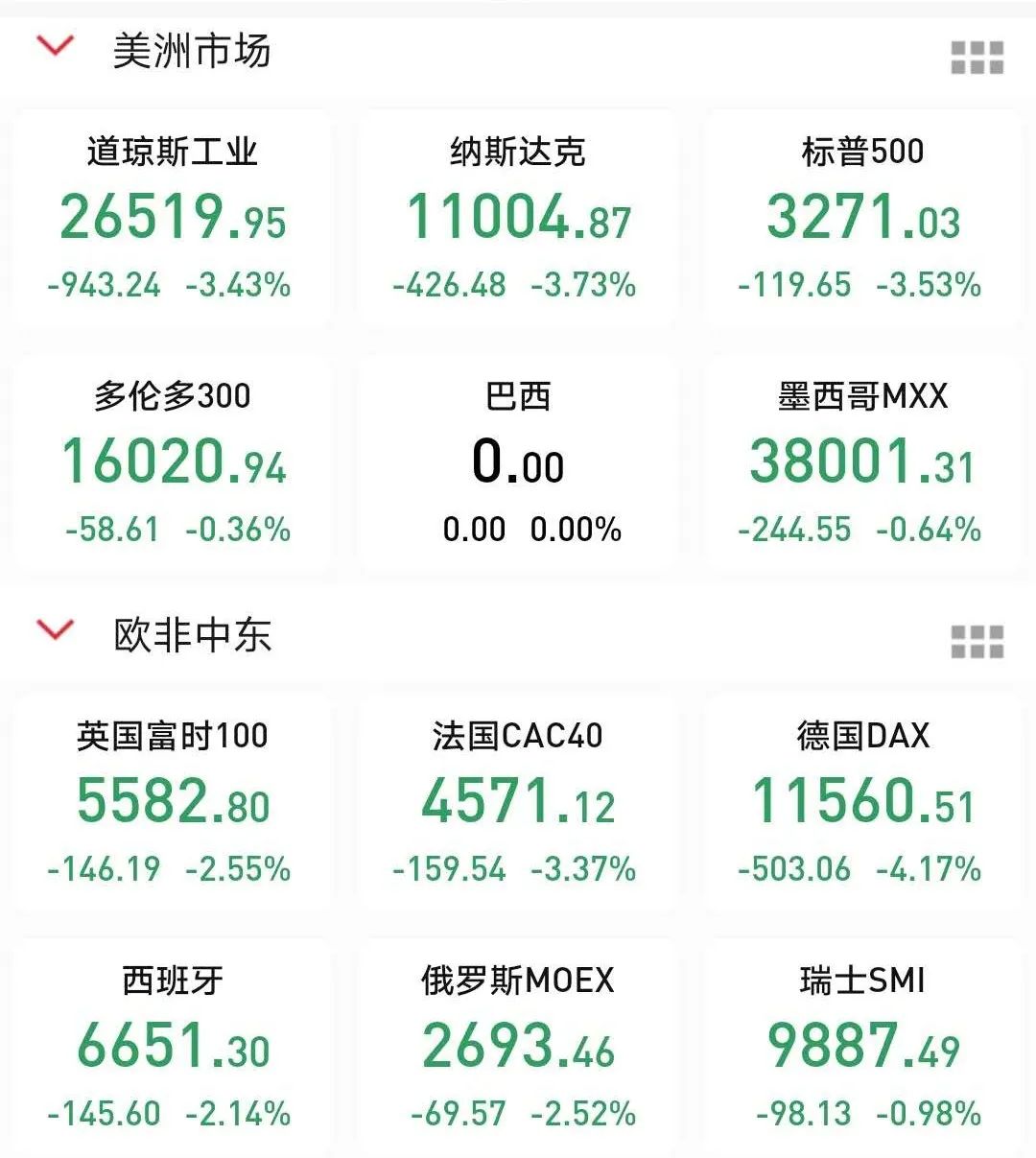 同日,美股全线收跌,道指重挫3.43%,纳指收跌3.73%,标普500指数收跌3.52%。贵金属、银行、航空和石油化工板块全数暴跌,泛美白银跌超9%,诺瓦瓦克斯跌超9%,Moderna跌超6%。科技股领跌纳指,英伟达跌超5.7%,谷歌、推特、微软均超5%,苹果跌逾4.6%。欧股收盘全线大跌,德国DAX指数跌4.17%,法国CAC40指数跌3.37%,英国富时100指数跌2.55%。欧洲斯托克600指数收跌3%,跌至5月22日以来低位。