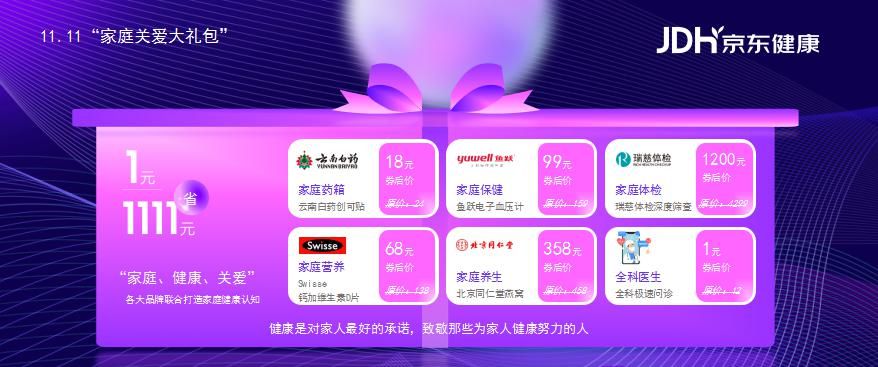 在“京东健康11.11家庭关爱计划”推出的“家庭关爱大礼包”中,京东健康围绕家庭药箱、家庭保健、家庭体检、家庭营养、家庭养生、全科医生”6大标签,为每个标签匹配单品,同时设置优惠券,组成劵包,从而实现1元省1111元的大幅优惠。同时,京东健康集结各大品牌联合打造“家庭、健康、关爱”的家庭健康认知,致敬那些为家人健康努力的人,帮助他们守护家人健康。