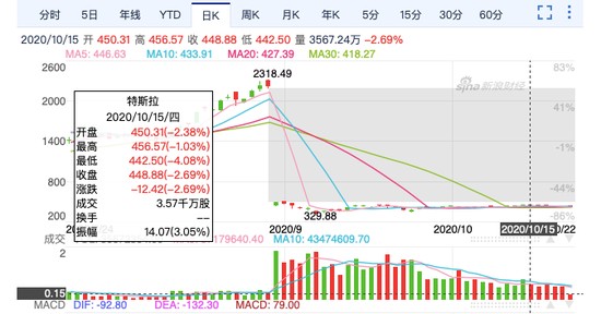 “信心保障计划”取消后,特斯拉(TSLA)股价出现明显波动。从特斯拉股价走势图来看,美东时间10月15日到10月20日,特斯拉股价的降幅在2%~2.69%之间,股价从461.3美元/股下跌至421.94美元/股。