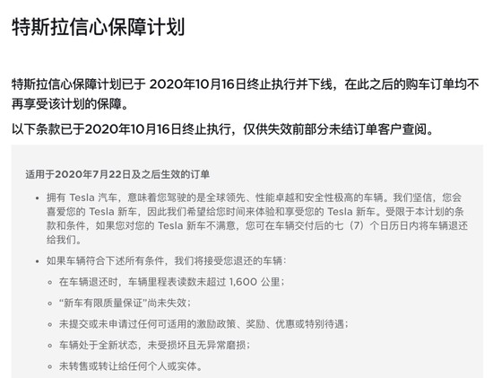 一个值得关注的变化是,日前,特斯拉中国官网发布消息称,特斯拉于2020年10月16日终止执行并下线“特斯拉信心保障计划”。特斯拉方面明确,该计划将仅供失效前部分未结订单客户查阅。这意味着10月16日之后的购车订单将不能再享受该计划的保障,消费者就算对特斯拉新车不满意,也不能再享有此前“7天无理由退车”的福利。