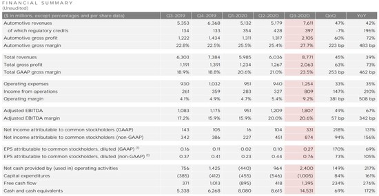 但亮眼的三季度财报依然给了特斯拉高速前行的信心和动力。北京时间10月22日,特斯拉对外发布的2020年三季度财报显示,今年三季度,特斯拉实现营收达87.71亿美元,同比增长39%,环比增长45%,高于市场预期的83.6亿美元;净利润为3.31亿美元,同比增长131%,环比增长218%,连续5个季度实现盈利。