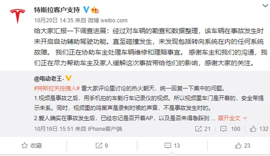 对此,10月20日下午,特斯拉汽车(北京)有限公司认证的微博账户“特斯拉客户支持”回应此事称,“经过对车辆的勘察和数据整理,该车辆在事故发生时未开启自动辅助驾驶功能。直至碰撞发生,未发现包括转向系统在内的任何系统故障。”