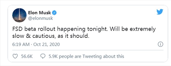 而特斯拉也在智能驾驶的研发道路上一贯采用激进态度。10月21日,据国外媒体报道,当地时间周二,特斯拉CEO埃隆·马斯克(Elon Musk)在推特上表示,公司的完全自动驾驶(FSD)测试版软件将于当晚向部分客户推出。不过,马斯克并没有透露哪些地区的车辆会收到推送。