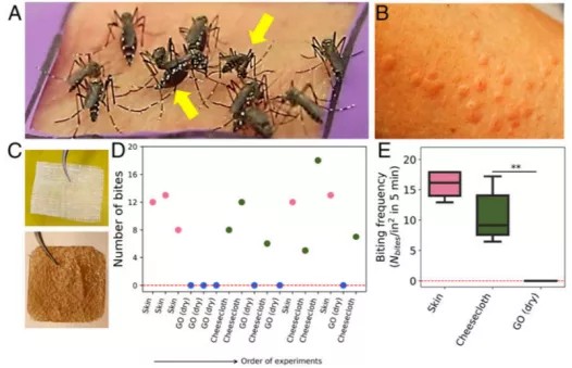 图A是蚊子的聚餐时候的照片,图B就是被叮之后的皮肤。图C 上面是纱布下面是氧化石墨烯(GO)纳米片。纱布是对照组实验。图D和图E是实验组和对照组实验的统计结果。可以看得到Skin代表的是裸漏的皮肤,而Go(dry)是干燥的石墨烯片,cheesecloth是纱布的意思。