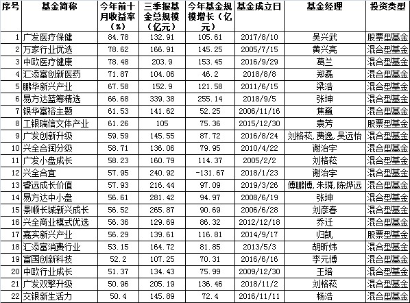 其中,吴兴武管理的广发医疗保健今年收益率84.78%,暂居百亿基金业绩冠军;万家行业优选、中欧医疗健康、汇添富创新医药等22只百亿基金产品,同期收益率也超过了50%。