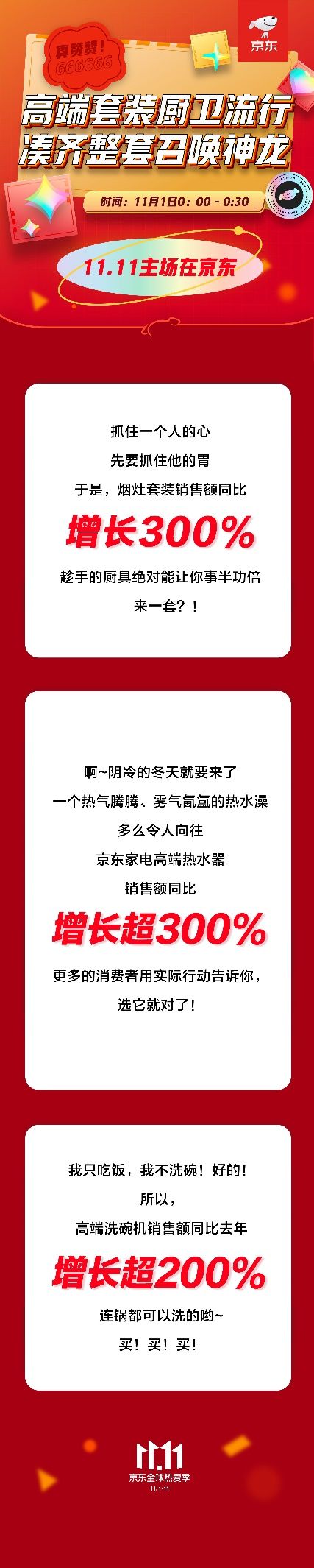 尤其是厨卫家电成交额极速上涨。受到疫情时期“宅家”经历影响,消费者深切感受到现代厨卫家电对于生活品质的提升,于是,在这个下半年最重要的家电大促节点,自然祭出了“买买买”的大旗!而高端化和套装化的厨卫家电在今年11.11受到消费者极致青睐。1日0点以后的30分钟,5000元以上的高端烟灶套装成交额同比增长300%,4500元以上的高端洗碗机同比增长超过200%,3000元以上的高端热水器同比增长3倍,其中专供京东家电的独家产品成交额占比超过50%。