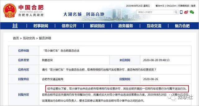 合肥市交通运输局在合肥市人民政府“12345政府服务直通车”回复网友:经市运管处了解,花小猪平台未在合肥市取得网约车经营许可,其在合肥开展的一切网约车经营行为均属于违法行为。8月20日,合肥市运管处正式约谈滴滴出行合肥分公司负责人,要求立即停止滴滴平台在合肥与花小猪平台之间的合作。