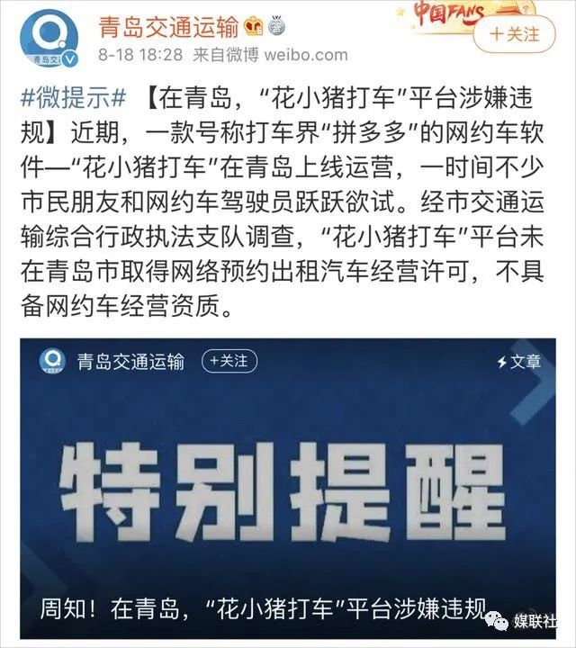 8月18日,@青岛交通运输 微博提示,“花小猪打车”平台未在青岛取得预约出租汽车经营许可,不具备网约车经营资质。