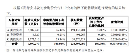 从另一个维度来看,网下有效申购股数为759.93亿股,抢夺这2.34亿股份额,其竞争激烈程度可见。