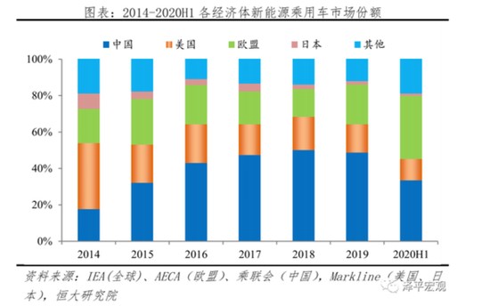 据 Markline 统计,2020 年上半年全球新能源乘用车(BEV+PHEV)销 量为 97.4 万辆,欧盟地区市场份额 2020 年上半年剧增,从 2019 年 21.9%直接提 升到 2020 年上半年 34.7%,市场份额反超中国;中国地区市场份额从 2018 年 50.2%下滑到 2019 年 48.8%、2020 上半年 33.5%。