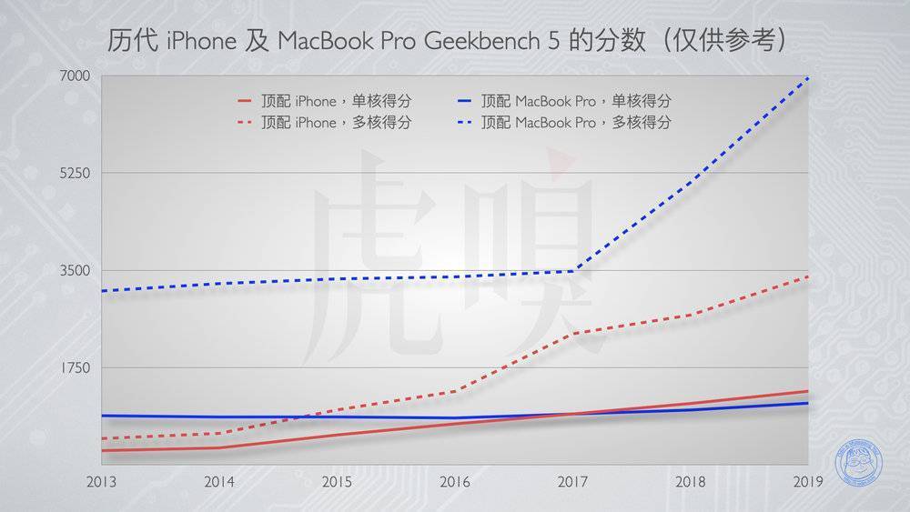 而同样是这段时间,iPhone 使用的苹果自家 A 系列新品啊,单核性能增加了整整 5 倍,直逼 Intel 芯片,多核性能增加了 6 倍。