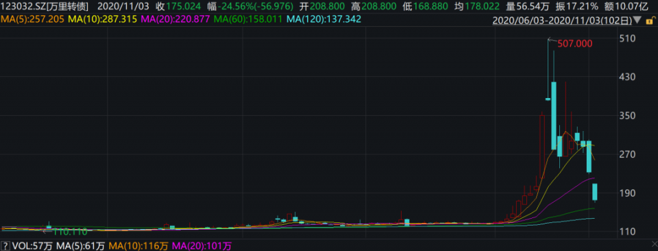 万里转债2周前一度暴涨至507元历的史最高价,而11月3日,万里转债跌幅最大时,价格一度来到168.88元。