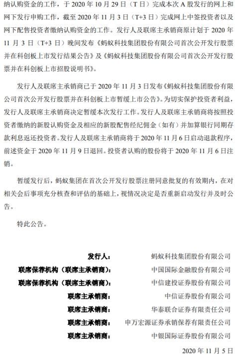 答:近期,上交所依据科创板注册管理办法相关规定作出了暂缓蚂蚁集团上市的决定。蚂蚁集团与主承销商经协商一致,拟于2020年11月6日启动退回A股网上、网下申购资金及战略投资者缴纳的认购资金等款项。