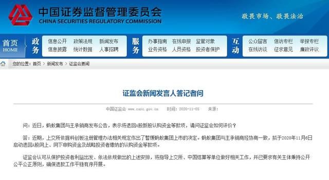 关于蚂蚁集团暂缓上市,启动退款程序,证监会对此进行了回答。