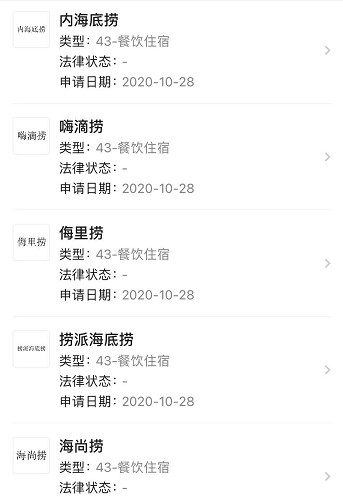 此外,在10月27日,海底捞还围绕“嗨”字一口气申请了86个商标,包括“小嗨妹妹” “乖小嗨” “小嗨家”等。两日合计新增263条商标信息,这些商标状态均为“商标申请中”。