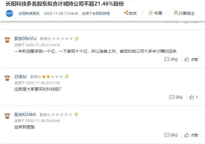 合计超过21%的减持比例,在目前的科创板公司中很少见。因此,减持公告刚一发出,长阳科技股吧中的网友就炸了锅。