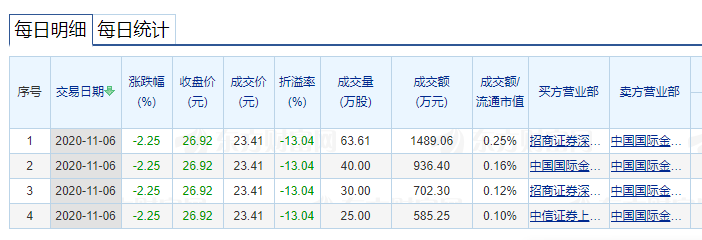 根据交易所公开信息,11月6日,长阳科技大宗交易成交158.61万股,成交价23.41元,折价13.04%。 由于卖方营业部均为中金公司上海分公司,不排除是单一股东的大宗交易行为。