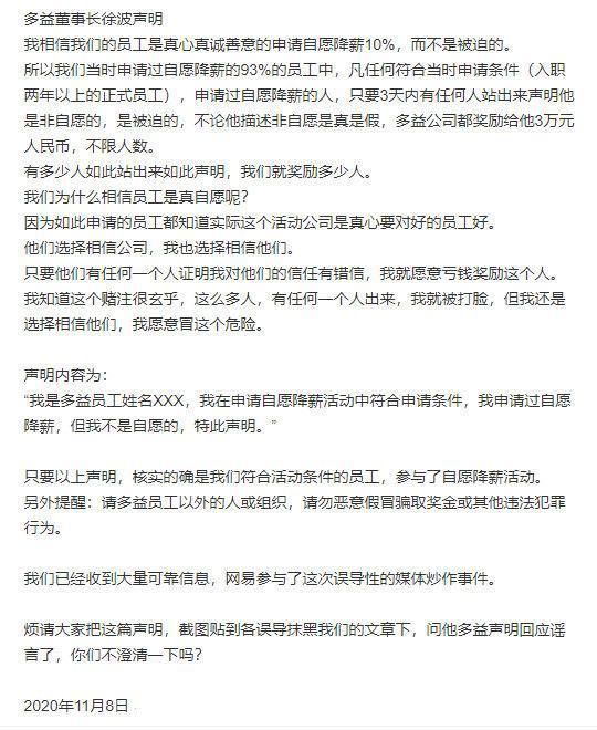 徐波称,当时申请过自愿降薪的93%的员工中,凡任何符合当时申请条件(入职两年以上的正式员工),申请过自愿降薪的人,只要3天内有任何人站出来声明他是非自愿的,是被迫的,不论他描述非自愿是真是假,多益公司都奖励给他3万元人民币,不限人数。有多少人如此站出来如此声明,我们就奖励多少人。