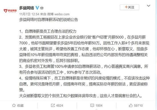 多益网络公告称,发图前员工杨毅廷在上家企业农业银行做“客户经理”月薪5000,在多益月薪7000,他却书面期望要求多益5年后给他年薪50万。因他工作入职4个多月来表现太差,被其主管批评,希望他改善工作态度,他却怀恨在心,断章取义、扭曲多益降低10%年薪但提高年终奖的真相,私自违法把公司内部发布的待遇调整相关的商业机密对外发布,后其引咎辞职。