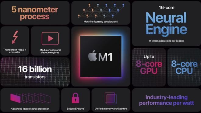 苹果声称M1芯片是市场上最高效的芯片。据苹果介绍,全新5纳米制程M1芯片封装了数量惊人的160亿个晶体管,而且将中央处理器、图形处理器、神经网络引擎、各种连接功能,以及其他众多组件,统统集成在同一块小小的芯片上。