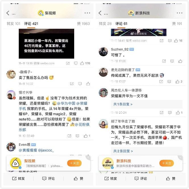 此外,还有多位网友表达了惋惜之情,一位网友表示“后悔9月份买的荣耀手机,荣耀若不属于华为,品质必然下降。甚至可能一天不如一天,下次买手机,选择水果,国产机走过场一样,不长期经营,遗憾!”,还有网友表示,“荣耀没有了华为的光环,还能荣耀吗?”