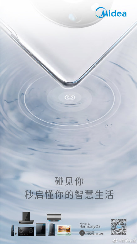 通过海报可以看出,海报上方是一台Mate40 Pro,中间为水的涟漪,下方则是美的智能家居产品,通过涟漪和宣传语不难看出,本次“碰一碰”将是与智能家居的主要交互方式。