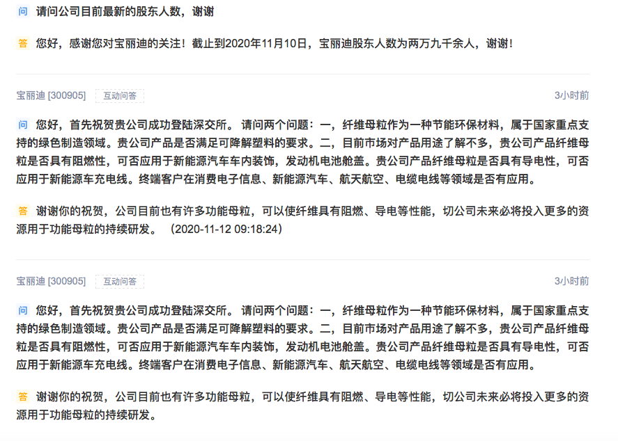 作为专注于纤维母粒研发与生产的行业龙头,股民对宝丽迪的表现深感疑惑。今天,面对股民的质问,宝丽迪在深交所互动易平台回应:公司目前也有许多功能母粒,可以使纤维具有阻燃、导电等性能,且公司未来必将投入更多的资源用于功能母粒的持续研发。