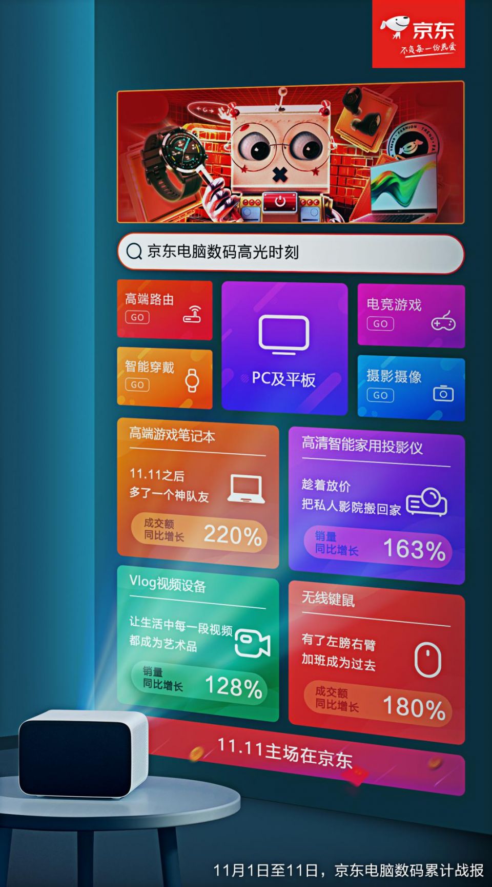 京东11.11全球热爱季在经历风起云涌的11天之后,成功完美收官落幕。坐镇11.11主场,京东再次以好物、低价、好服务,在消费者中掀起一场全民参与的购物狂潮,创下京东11.11期间累计下单金额超2715亿元的惊艳战绩,再创新高!而电脑数码更是作为京东11.11主战场,11月1日到11月11日期间,高端游戏笔记本电脑成交额同比增长220%,高端RTX系列显卡成交额同比增长180%,PC、影像、智能、文仪等品类均实现销售井喷,彰显出了消费者旺盛的消费热情,更为全行业献上了一场最酣畅淋漓的全民购物大狂欢。