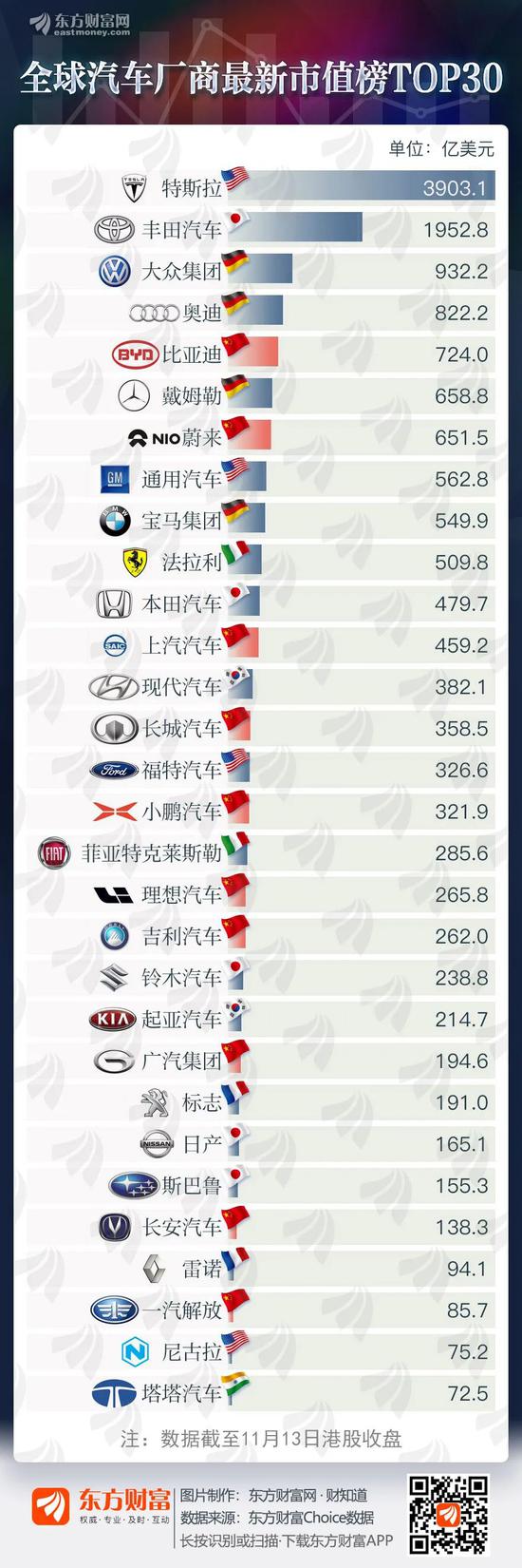 据东方财富网统计,在全球市值排名前30的知名汽车厂商中,中国企业有10家,有2家企业冲进前10。截至11月13日,比亚迪市值约724亿美元,超越戴姆勒的659亿;蔚来市值652亿美元,超越通用和宝马;长城汽车市值359亿美元超越福特;小鹏汽车市值超300亿美元,理想、吉利等车企市值也均超200亿美元。