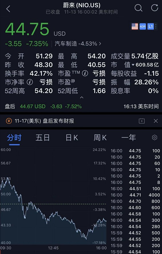 蔚来汽车将于11月17日下周二美股盘后公布三季度财报。此前,造车新势力小鹏汽车和理想汽车财报利好,推动中概汽车股近日接连冲上新高。截止周四收盘,过去一个月,蔚来汽车股价翻倍、累涨逾123%,今年以来股价涨了11倍,去年底交投在4美元一线。