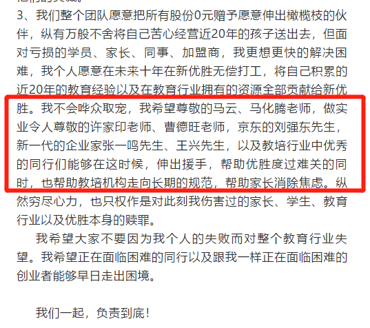 他甚至“隔空喊话”马云、马化腾等企业家接盘。“我不会哗众取宠,我希望尊敬的马云、马化腾老师,做实业令人尊敬的许家印老师、曹德旺老师,京东的刘强东先生,新一代的企业家张一鸣先生、王兴先生,以及教培行业中优秀的同行们能够在这时候,伸出援手,帮助优胜度过难关的同时,也帮助教培机构走向长期的规范,帮助家长消除焦虑。纵然穷尽心力,也只权作是对此刻我伤害过的家长、学生、教育行业以及优胜本身的赎罪
