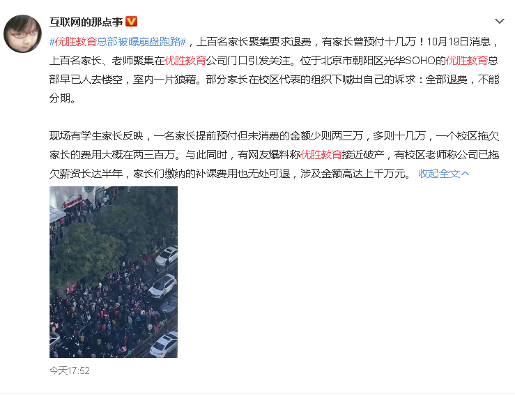 据财新报道,2020年10月19日,北京优胜教育总部,前来退费的学生家长,以及被拖欠工资的优胜教育员工聚集维权。据前来维权的家长介绍,上午来维权的人最多,可达3~4千人。