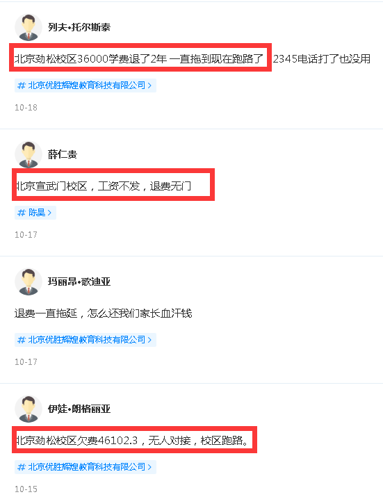 如北京劲松校区36000学费退了2年,一直拖到现在跑路了;北京劲松校区欠费46102.3,无人对接,校区跑路。