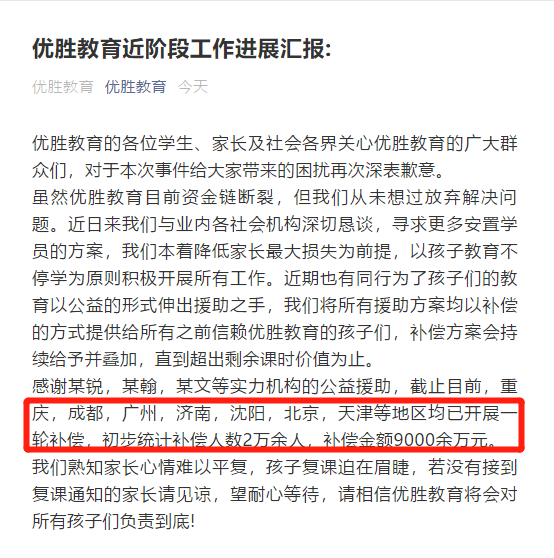 优胜教育指出,感谢某锐,某翰,某文等实力机构的公益援助,截止目前,重庆,成都,广州,济南,沈阳,北京,天津等地区均已开展一轮补偿,初步统计补偿人数2万余人,补偿金额9000余万元。