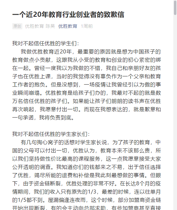 值得注意的是,一周前,优胜教育的创始人陈昊刚发布一封《一个近20年教育行业创业者的致歉信》,信中,他表示疫情下,他本以为卖房卖车能撑住,但却连累到正常经营的小区,加速了总部资金链断裂。竭尽所能的退费和补偿是他此刻最想做的事情。