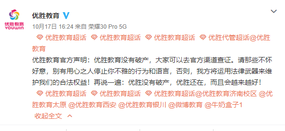 值得注意的是,10月17日,优胜教育官方声明,优胜教育没有破产,请那些不怀好意,别有用心之人停止不雅的行为和语言,会用法律武器维护自己合法权益。