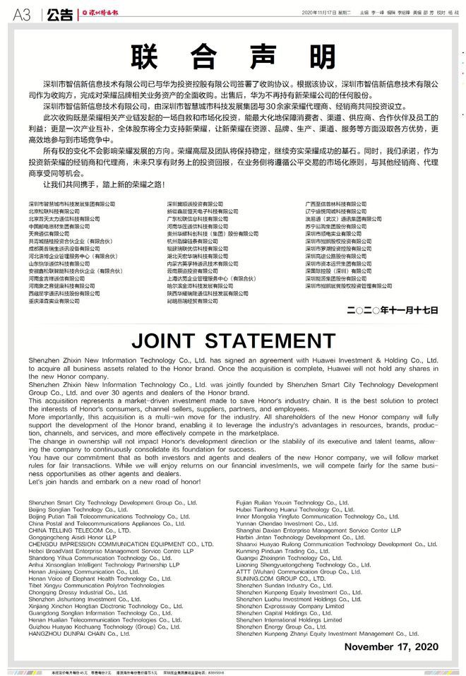今日(17日),多家企业在《深圳特区报》发布联合声明,深圳市智信新信息技术有限公司已与华为投资控股有限公司签署了收购协议,完成对荣耀品牌相关业务资产的全面收购。出售后,华为不再持有新荣耀公司的任何股份。