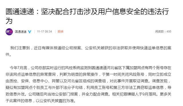 11月17日,针对圆通内鬼致40万条个人信息泄露一事,圆通速递有限公司官方微博回应称,已报案,相关嫌疑人于9月落网,坚决配合打击非法售卖和使用快递用户信息的行为。全文如下: