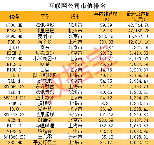 在阿里股价调整之际,腾讯也趁机反超阿里,成为市值最高的上市公司,超过4.8万亿元。从整体来看,上海及北京的大型互联网企业更多,北京有8家千亿市值互联网企业,上海有7家。深圳有腾讯控股和腾讯音乐,广州有网易和唯品会,杭州有阿里巴巴(阿里健康总部在香港),天津有三六零,长沙有芒果超媒。