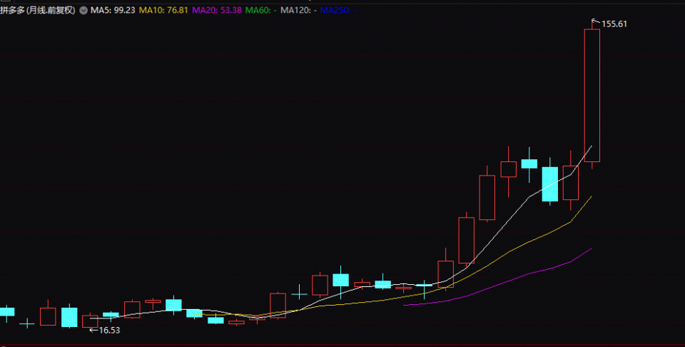 在新能源汽车三大新势力大跌的背景下,美股市场上的电商“新势力”,拼多多股价依然在狂飙突进之中。上周五,拼多多股价再度暴涨近13%,站上150美元大关。截至当日收盘,拼多多市值超过1.2万亿元人民币,已经超过农业银行最新总市值,后者市值不到1.1万亿元人民币。在互联网公司中,拼多多也成为仅次于腾讯阿里美团,成为市值第四大互联网公司,相当于百度最新市值的近4倍。