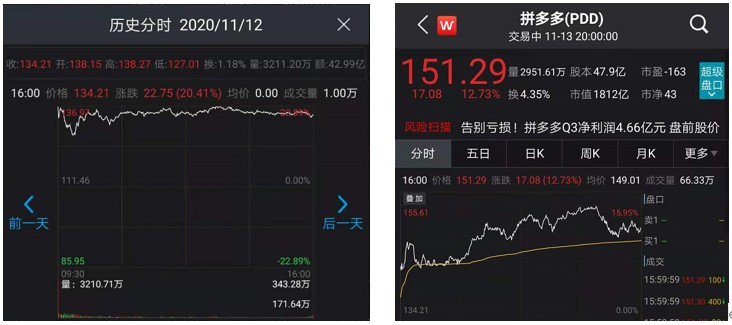 受此消息刺激,拼多多12日盘前涨超22%,最终收涨超20%。13日拼多多股价延续了上涨趋势,收涨12.73%。而拼多多的市值也一跃超过京东,达到1812亿美元,成为ATM(阿里、腾讯、美团)之后上市市值第四的互联网公司。