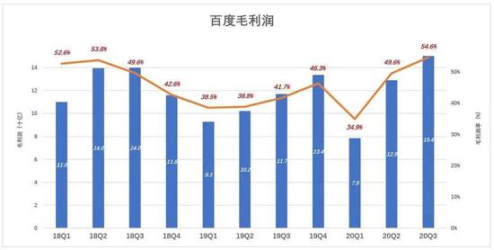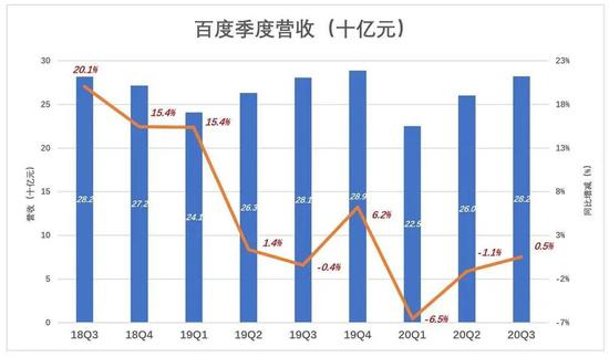 2020年Q3,营收282亿、同比增长0.5个百分点,与2018年Q3并列为“百度史上最赚钱第三季”。