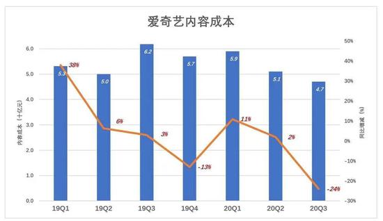 2019年Q3,爱奇艺内容成本高达62亿,相当于爱奇艺营收的83.6%,百度营收的22%!巨额投入下,爱奇艺季度营收同比增幅仅为6.9%。此后的四个季度中,有两个季度内容成本出现回落。