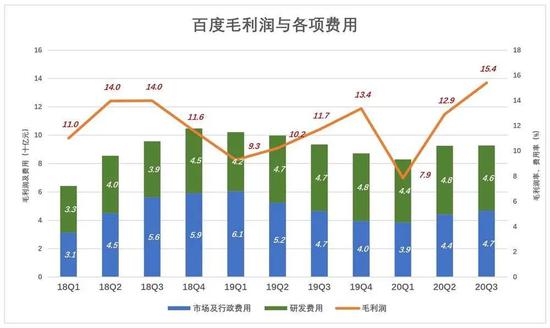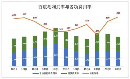 随着毛利润率高的大搜业务在营收中占比下降,百度整体毛利润率震荡下行,低谷出现在每年Q1。2018年Q1、2019年Q1,毛利润率分别为52.6%、38.5%。2020年Q1更跌至34.9%。2020年Q2、Q3分别升至49.6%、54.6%。