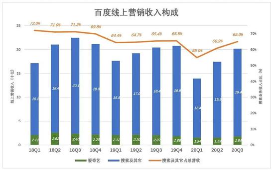 百度线上营销收入主要来自“大搜”和“信息流广告”(Baidu Core)及爱奇艺。2020年Q3“大搜”、“信息流广告”营收合计为184亿,与2019年Q3持平;爱奇艺广告收入18.4亿,较2019年Q3减少2.3亿。