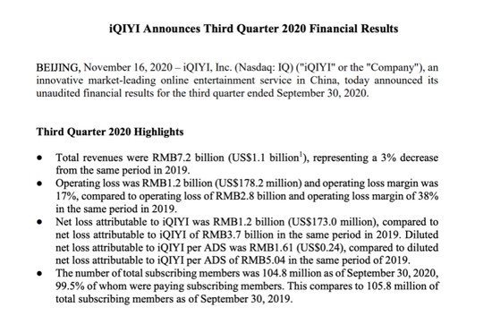 11月17日,爱奇艺公布了截至2020年9月30日的第三季度未经审计的财务报告:会员服务收入占比过半、净亏损数十亿元,依旧是爱奇艺的财务常态。